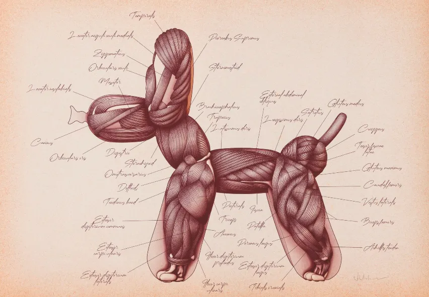 Dariusz Sebastian Burdon是一位现居英国的波兰艺术家,他善于运用出人意料的视角和夸张的表现手法,将日常物品转化为具有深刻内涵的艺术作品。他的作品题材广泛,涵盖雕塑、版画和公共艺术项目;其中,气球狗雕塑是其代表作之一,采用木材、玻璃纤维、树脂和瓷器等多种材质制作,展现了他在材料运用和造型设计上的高超技艺。