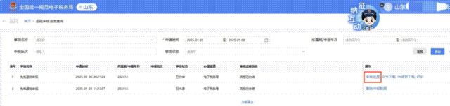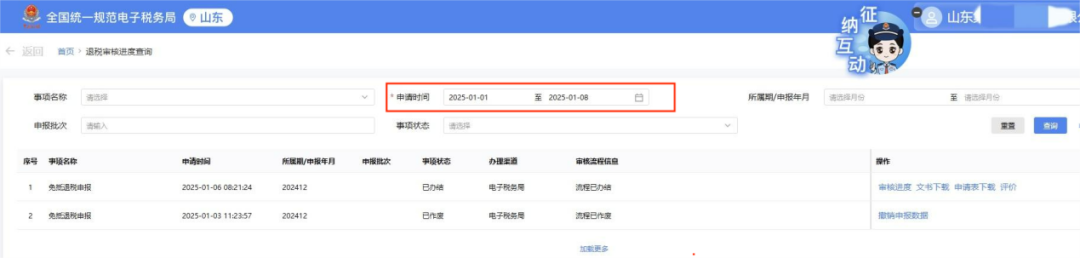 二、选择申请时间起止日期后点击【查询】,即可跳转出该时间范围内的申报记录。