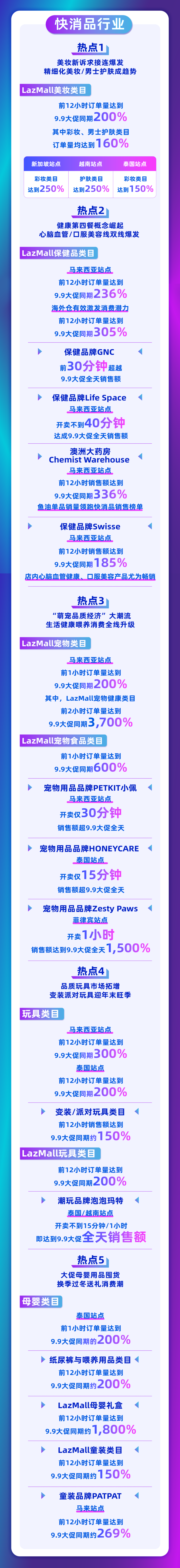 为提升大促购物体验,Lazada也准备了充足的运力预案。其中,Lazada海外仓实现分钟级出库,跨境首单于11号早上8点17分送达签收。海外仓极速到家的跨境购物体验已深入东南亚消费者心中,推动仓内商品销售全面爆发,其中家电(料理机、吸尘器),消费电子(吹风筒),户外电源及个护类目(脱毛仪)订单量对比9.9大促超10倍增长。此外,大促第三方海外仓同样表现亮眼,10小时即达成9.9大促全天销量的2倍。