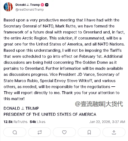 根据特朗普表示,其已与北约秘书长马克·吕特达成富有成效的会晤,已就格陵兰岛乃至整个北极地区的未来协议构建了框架,因此,他不会对8个欧洲征收原定于2月1日生效的关税!