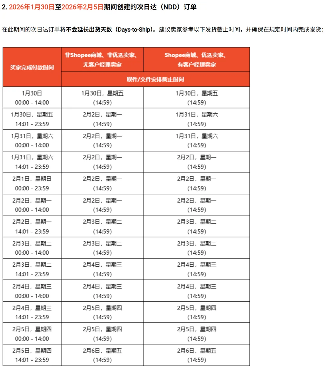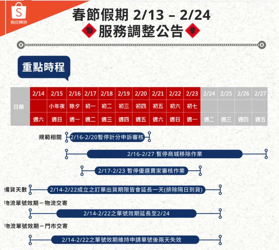 以Shopee中国台湾本土店为例,平台最长备货天数为10天。同时据平台官方公告,2月14日(周六)至2月22日(周日)期间生成的订单,除隔日到货订单外,出货期限均统一延长1天。且针对卖家在春节假期内因不可抗力因素产生的违规计分,平台将提供相应的罚分豁免与申诉渠道。