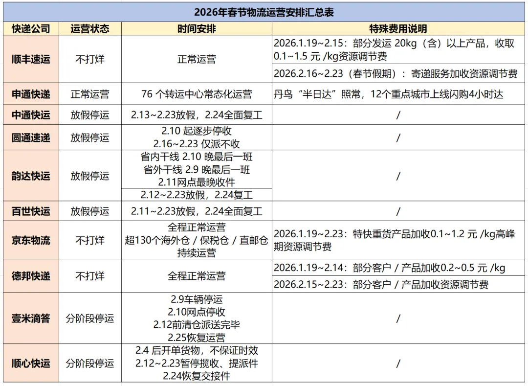 ⚠️注意:部分加盟制网点可能提前停运,需主动联系所在网点尽早核实;即便商家宣传春节期间店铺不打烊,快件在运输途中仍需途经多个中转节点,只要任一环节的加盟网点、中转站点假期停运,便会直接导致包裹在途滞留,建议卖家抓紧最后时效做好物流规划与订单安排。