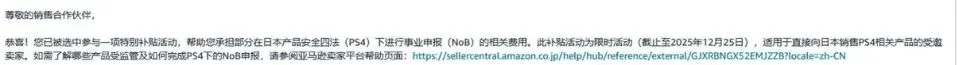 亚马逊针对日本站卖家推出重磅日代补贴:仅收到官方补贴邮件的卖家,在 12 月 25 日前通过亚马逊 SPN 服务商完成日代合规申报(NoB 申报)并通过平台审查,即可领取 76000 日元(约合人民币 3700 元)广告补贴。
