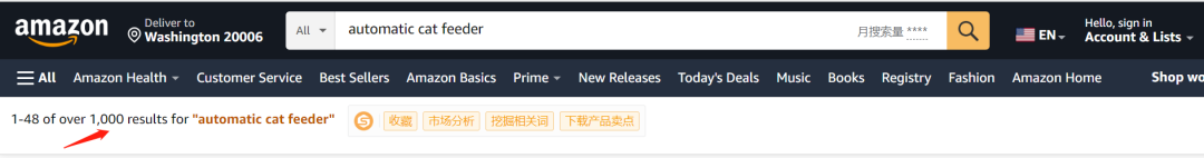 拿“automatic cat feeder”来说:月搜索量大概31944,搜出来结果大概1000个产品:31944 / 1000 / 30 ≈ 1.06。