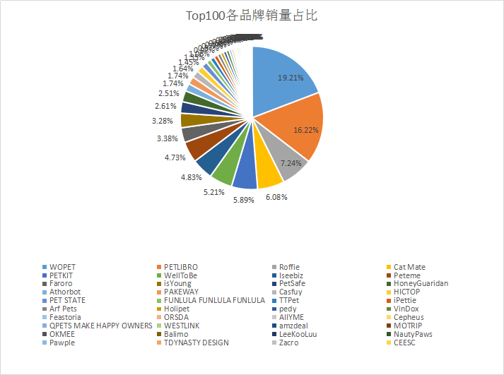 销量前100的产品,分散在45个品牌手里。老大WOPET占了19.21%,老二PETLIBRO占16.22%,加起来也没到50%,没有哪个牌子说了算。
