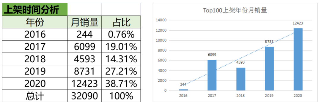 Top 100中新品销量占比突出,且随上架年份递增。同时,2017年产品仍存于Top 50。