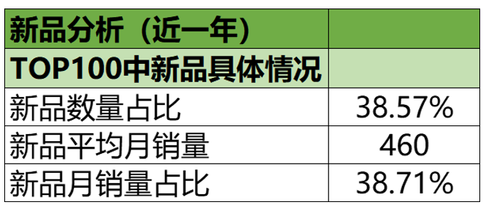 新品数量占Top 100的38.57%,销量占比38.71%。