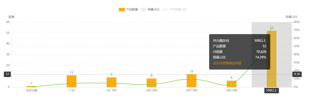 重点看: 如果最近半年上新的产品销量占比超过15%,说明进去的门槛不高。评分分布很关键——4.3分以上的产品占比越高,说明产品越完善,你想做差异化或者改进的空间就越小。