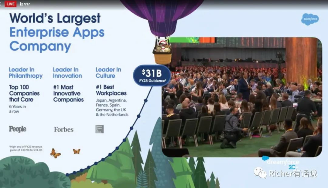 2022年旧金山的Salesforce年会Dreamforce和Saastr几乎同时间同地点举行,作为ToB赛道的全球盛会,疫情后又恢复了一票难求的状态,这也侧面昭示着行业的归来。本文的内容也从此开始。这是一个值得SaaS行业铭记的瞬间:Salesforce CEO Marc Benioff在面对着全球无数客户和开发者的开篇的陈述上,第一页PPT赫然写着:Salesforce是世界上最大的Enterprise APPs企业。