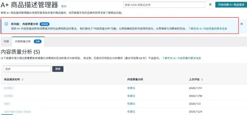 目前这个功能还在小范围测试中,但亚马逊已明确表态,接下来会逐步扩大检测范围。卖家可以打开后台的“A+商品描述管理器”自查,如果页面质量不佳,系统会显示“需要改进”(红色警报)或“有可用建议”(黄色提醒)。