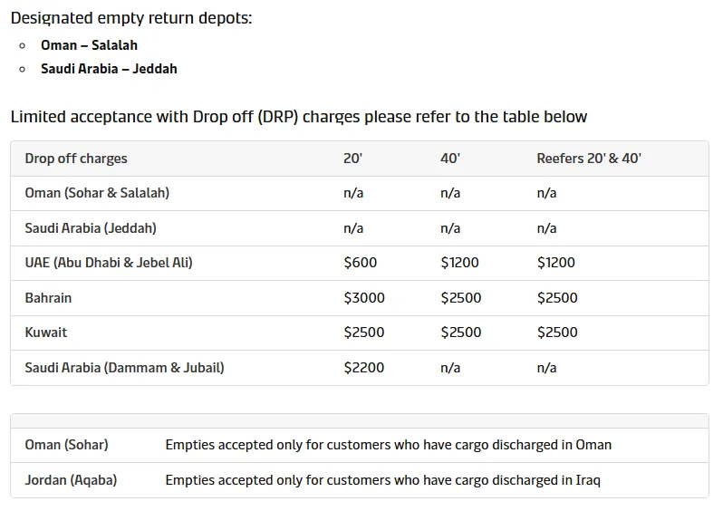 若客户无法将空箱运至指定堆场,马士基将收取“还箱附加费”(Drop-off Charges, DRP),具体标准如下: