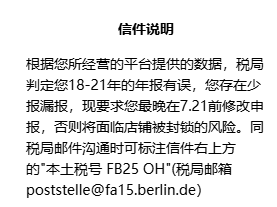 深圳卖家范先生是第一个受害者,他前段时间突然收到德国税局的邮件,说 2018-2021 年期间少报漏报税款,要求 7 月 21 日前补税 5 万欧元(约 42 万人民币),否则直接封店。