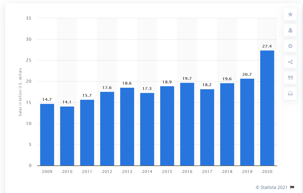 根据往年国外的消费数据统计,情人节的销售额仅低于圣诞节,2020年美国消费者在情人节的花费更是有了明显增长(见下图)。