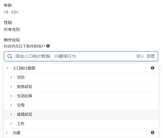 • 性别:有调研显示男性在情人节的花费是女性的两倍,因此,受众针对男友和丈夫,而不是女友和妻子,ROI 会有所提高。当然在预算允许的情况下,可以考虑为男友,女友,丈夫和妻子分别创建广告,可测试不同类型的受众对于产品的接受度和广告效果,在后续的调整中可以更有效地利用预算。