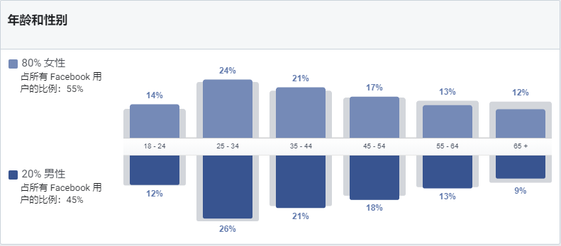 • 年龄:虽然情人节礼物老少皆宜,但是 Facebook Audience Insight 显示25-54周岁年龄段的人对参与情人节的活动更有兴趣,当然还是要具体结合自己的产品类型适宜的人群来筛选目标受众。