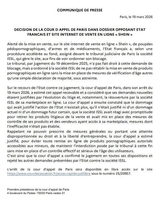 最近跨境电商圈出了个大新闻,3月19号法国巴黎上诉法院给出终审裁决,直接把法国政府告希音的案子给驳回了,除了保留未成年人年龄验证的禁令,政府要求全面封锁希音(Shein)