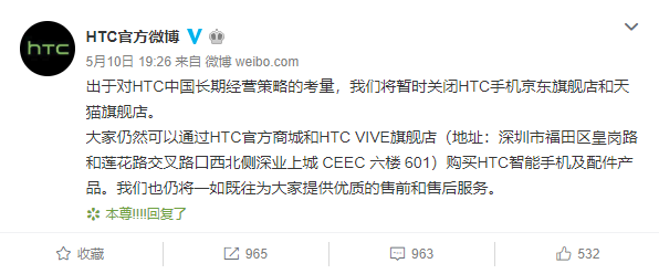 “出于对HTC中国长期经营策略的考量,我们将暂时关闭HTC手机京东旗舰店和天猫旗舰店。大家仍然可以通过HTC官方商城和HTC VIVE旗舰店(地址:深圳市福田区皇岗路和莲花路交叉路口西北侧深业上城 CEEC 六楼 601)购买HTC智能手机及配件产品。我们也仍将一如既往为大家提供优质的售前和售后服务。 ”