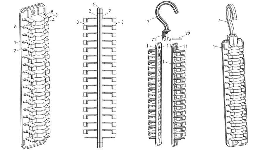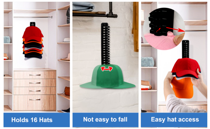 原告Jiang Zhongyi是一位国人卖家,他为帽子爱好者们精心设计了一款Hat Rack帽架。采用了垂直支撑面设计,上下分层布局的连接端口通过水平隔板进行划分,每一层都能够独立承托帽檐,与顶部定位平台和底部支撑平台的间距相结合,形成了一个“深槽式”固定结构。即便多顶帽子重叠存放,也能保持其挺括的廓形,该款产品在市场上受到了广泛好评。