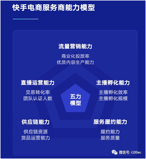 在服务商落地和实战过程中,快手电商也在不断梳理践行直播电商服务商的“五力”模型:流量运营能力、直播运营能力、主播孵化能力、供应链能力,以及服务履约能力。