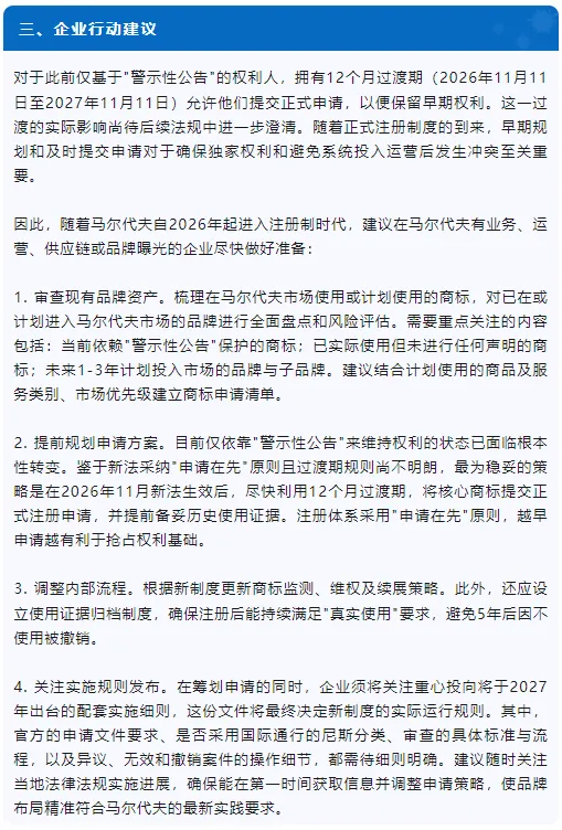 根据官方公告,《商标法》将于2026年11月11日生效。法律生效后,现有依赖"警示性公告"的权利人将有 12 个月过渡期办理商标重新注册,以确保权利延续。该法的配套实施细则预计将在法案生效后六个月(约2027年5月)发布。与此同时,《马尔代夫知识产权局法》(Maldives Intellectual Property Office Act,Law No. 12/2025)将于2026年1月1日生效,正式设立马尔代夫知识产权局(MIPO),负责包括商标在内的知识产权管理工作。