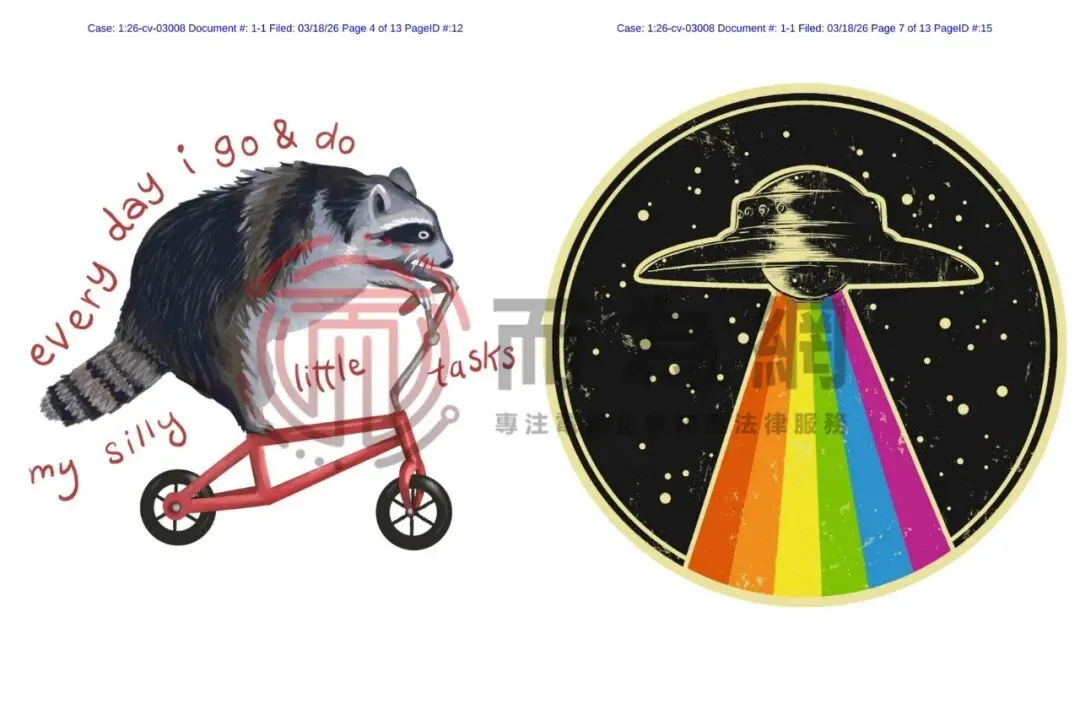 原告Zeraph Moore是一位来自美国的插画师和平面设计师。其创作风格以充满趣味性和独特风格为主,灵感主要来源于太空探索、另类美学以及动物世界。自2018年起,他以“BoyPilot Goods”为名开设Etsy店铺,将自己的原创设计转化为乙烯基贴纸、礼品包装、笔记本、服饰和配饰等多种产品进行售卖。