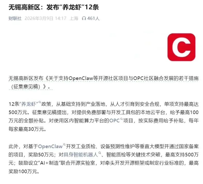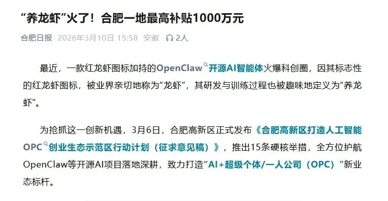 合肥高新区:发布“龙虾15条”,提供亿元级扶持。设立亿元级专项扶持资金,相关项目最高获1000万元股权投资;企业部署OpenClaw按实际投入30%补贴,单家最高200万元;提供3个月免费国产算力,模型调用费用补贴30%,同时开放政务、工业等场景,免租金提供产业园区办公场地,配套人才住房政策[。此外,还推出“算力券、语料券、模型券”三重礼包,最高可申领1000万元算力券,覆盖研发全流程。