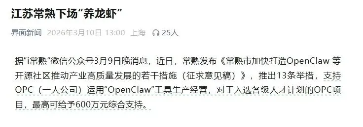 苏州常熟市:聚焦中小企业,降低落地门槛。为本地中小企业提供OpenClaw免费基础版本与部署指导;联合金融机构提供最高500万元低息贷款与全额担保;试点企业最高补贴30万元,获奖项目额外给予10万-50万元奖励,重点聚焦纺织、装备制造及直播电商等特色领域落地。同时,对服务成效显著的部署平台,给予最高300万元专项补贴。