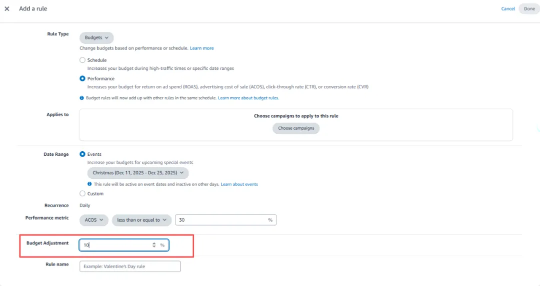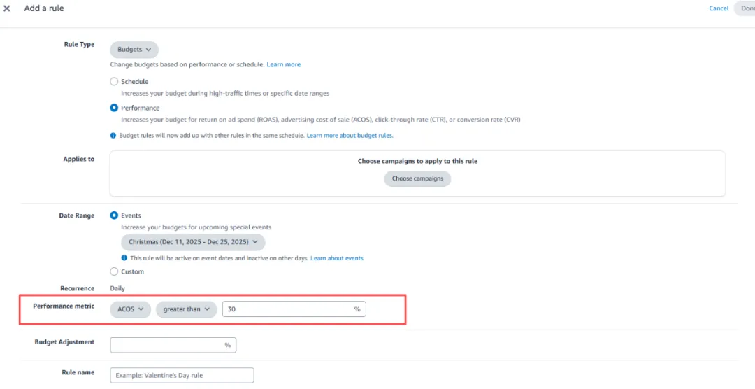 表现提升助推规则 条件:转化率 > 20%,点击量 > 15 动作:提高竞价5%-10% → 让系统自动为优质关键词加码。 新品词触发规则 条件:新关键词出现在搜索词报告,且订单数 ≥ 2