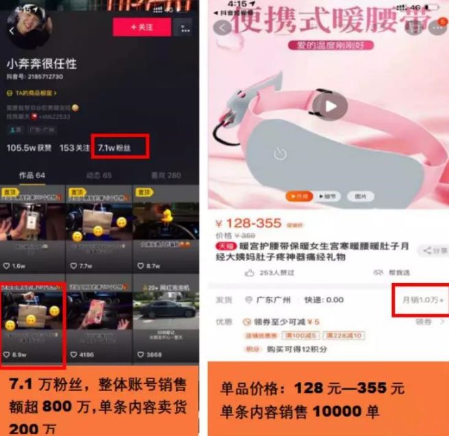 7.1万粉丝抖音账号,一条点赞8.9万的抖音内容,将一款女性暖腰带,通过抖音橱窗销售超过10000单,单价128元—355元,单日卖货200万!很多人惊讶,为什么同样的产品,在淘宝上销不动,却到抖音上就能销售翻上百倍,千倍;