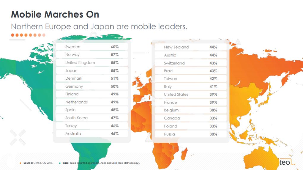 近日,一份来自Criteo公司的报告显示,全球智能手机在线交易量在不断地上升中,其中北欧和日本的增长最为显著。在这些地区中,移动交易量目前占到在线交易的一半以上。该研究显示,排名前三的国家分别是瑞典(60%)、挪威(57%)和英国(55%)。