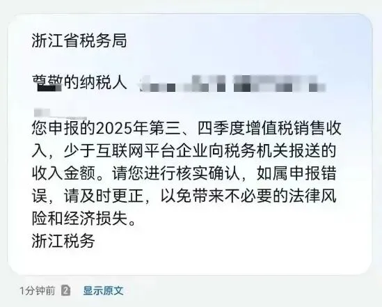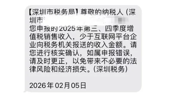 2026 年 2 月 5 日当天,从浙江温州、安吉,到广东深圳、广州,再到江苏、安徽合肥、福建厦门、湖南长沙等跨境电商活跃省市,卖家的手机陆续收到税务部门的统一格式预警短信,内容均为提醒申报收入与平台报送数据存在差异,需核实更正。