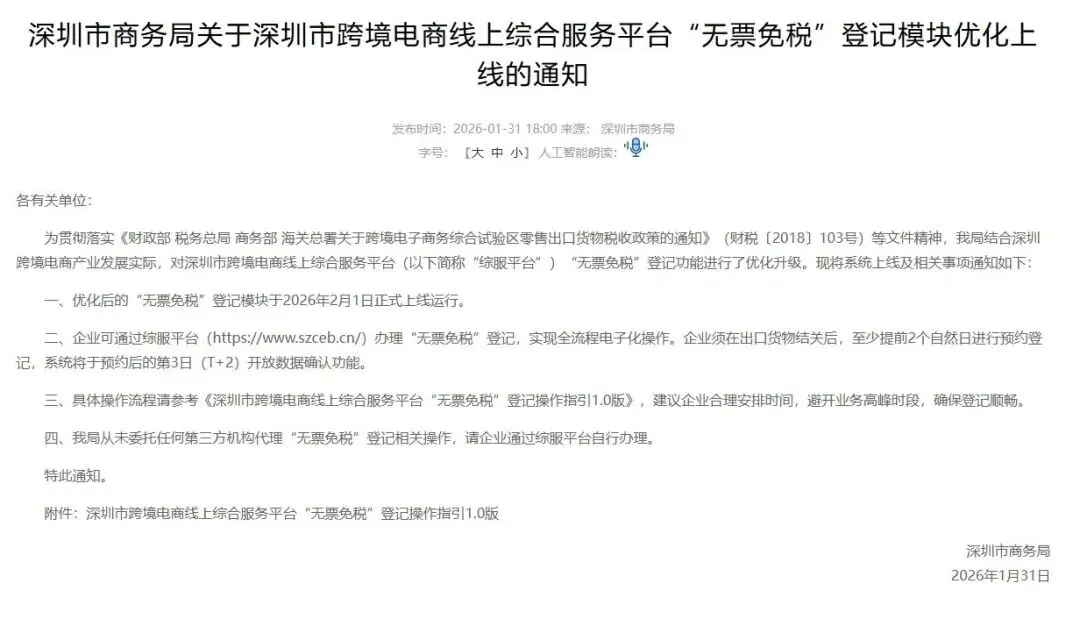 当下,针对税务情况,2025 年四季度起,深圳、广州等地陆续发布跨境电商及外贸出口企业的 “无票免税” 政策优化措施,2026 年 2 月 1 日,深圳市跨境电商线上综合服务平台的 “无票免税” 登记模块已正式优化上线,该政策适用于 9610 跨境电商零售出口模式,能有效降低卖家的税务成本,且未来这一政策有望扩展至全国 165 个跨境电商综试区。