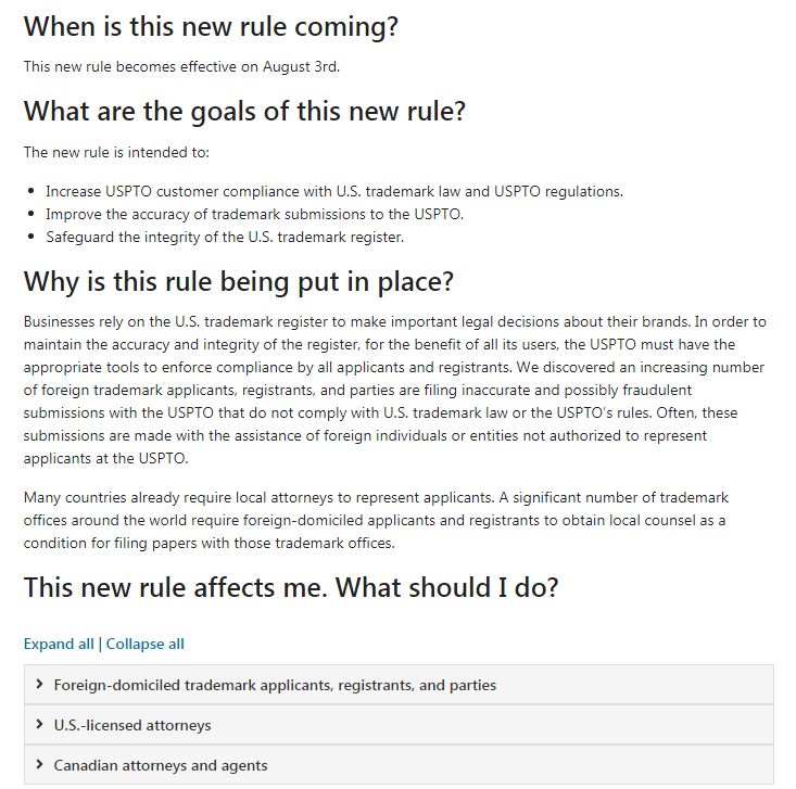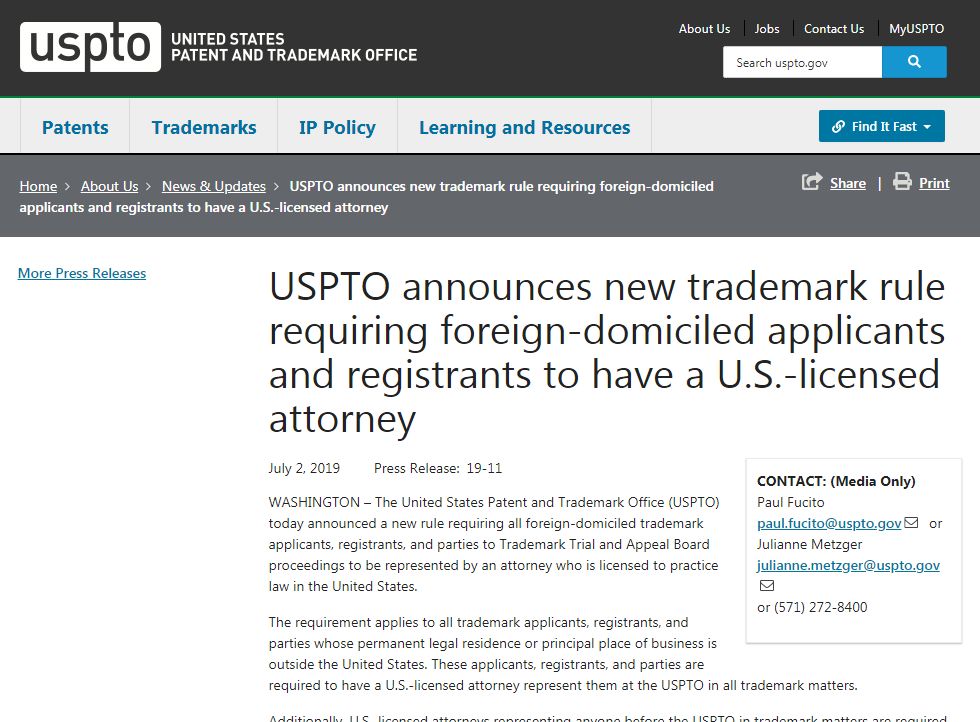 美国专利商标局(USPTO)于7月2日宣布了一项新规定,要求所有外国注册商标申请人,注册人以及商标审判和上诉委员会诉讼的当事人均由获得美国执业许可的律师代理。