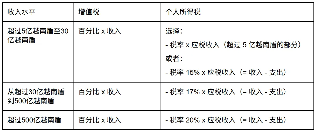 📢年收入超过5亿越南盾,个体经营户必须按月或按季度申报和缴纳税款。具体征收标准如下: