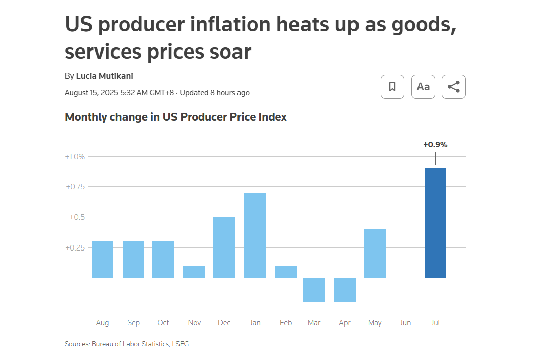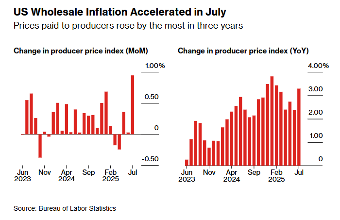 市场预计,美国7月批发通胀率将出现回升迹象,显示企业吸收高额关税成本的能力正在减弱,消费者价格上涨压力正在逼近。
