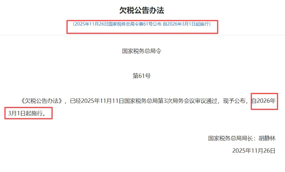 就在上个月,国家税务总局正式公布了《欠税公告办法》,并明确从2026年3月1日起,欠税信息将按月向社会公示。