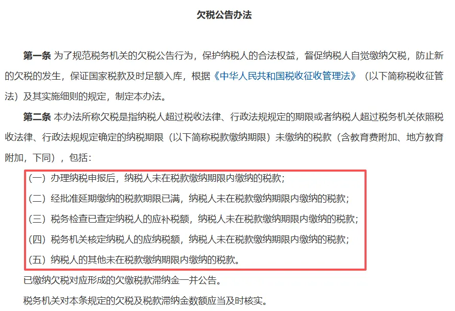 根据新办法,只要税款到期未付,就算欠税。具体包括5种情形,比如申报后没按时交、延期到期没交、查补税款没交等等。连产生的滞纳金,也会一并公示。