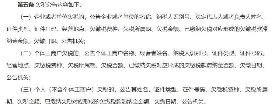 对企业和个体户:会公示企业名称、纳税人识别号、法定代表人(或经营者)的姓名和身份证号、经营地点、欠税金额和滞纳金。