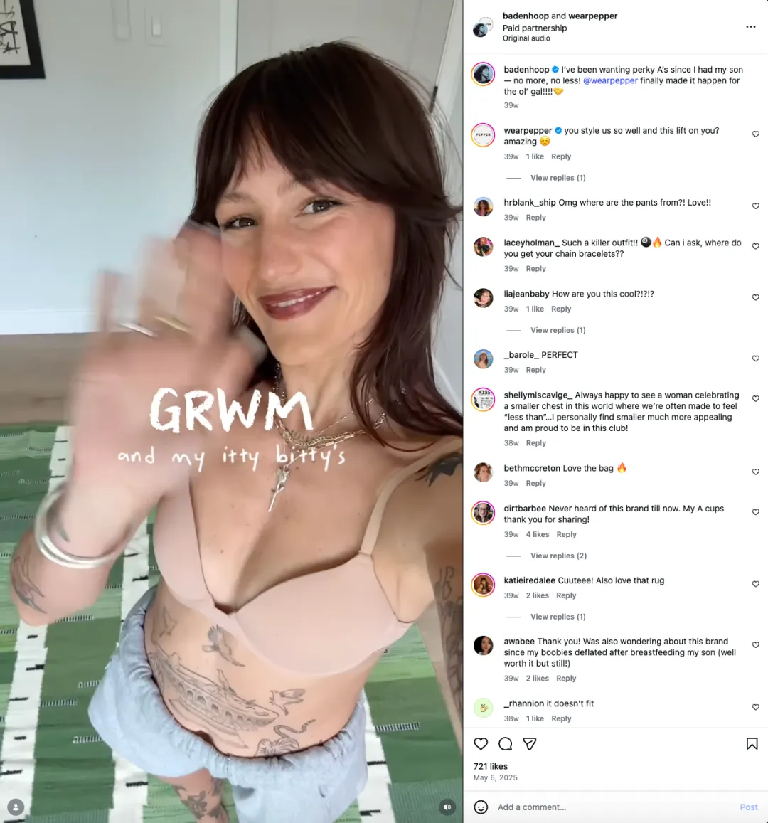 更重要的是,Pepper 合作的红人往往在身份上与品牌高度一致。她们并不是为了合作才“扮演”小胸视角,而是长期在内容中讨论身材困扰、穿衣体验和自我接纳。