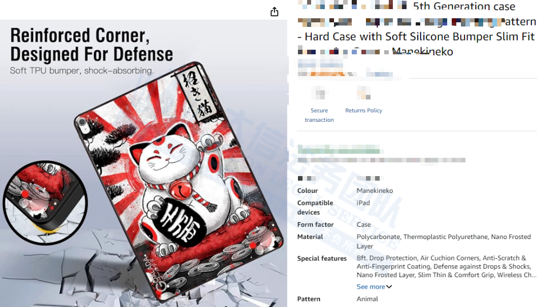 此案为版权维权,涉及6张版权作品,风格为日式狐神、和服女人等形象的黑白红色系画作,以下是涉及专利的具体信息,未经授权不得擅自使用,侵权风险极高!跨境卖家尽快检索下架,否则会有TRO侵权风险!