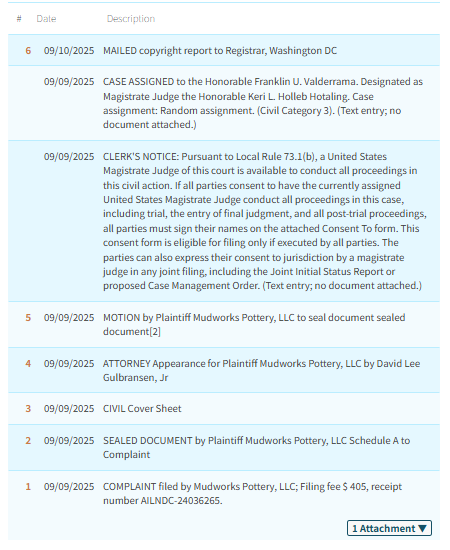 原告MudWorks Pottery LLC是一家专注于手工陶艺制作的小型企业,由创始人Sarah Thompson于2015年在美国俄勒冈州波特兰市创立。品牌秉承“泥土与灵感共生”的理念,坚持每件作品均由匠人全手工制作,凸显天然陶土的温度与独特肌理。其产品系列涵盖日常食器、花器及艺术装饰,以有机形态、细腻触感和大地色系著称,完美融合了实用功能与自然美学,深受追求生活品质与手作魅力的消费者喜爱。