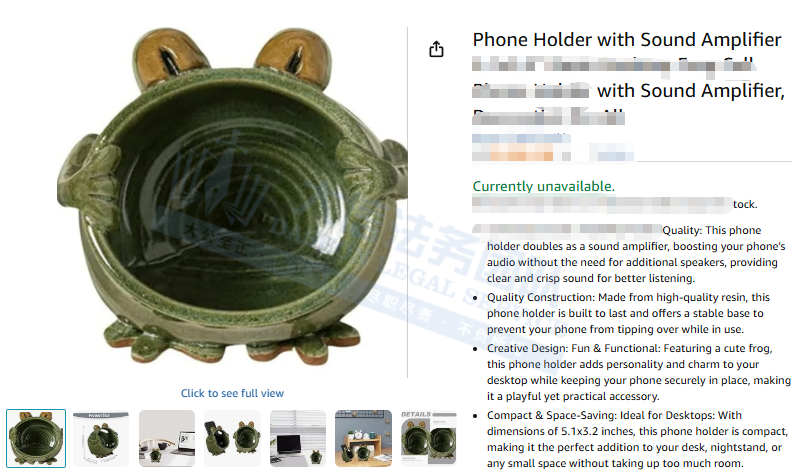 此案为版权维权,版权号:VA 2422496,是一个青蛙外形的陶瓷器具,以下是相关版权的具体信息,未经授权不得擅自使用,侵权风险极高!跨境卖家尽快检索下架,否则会有TRO侵权风险!