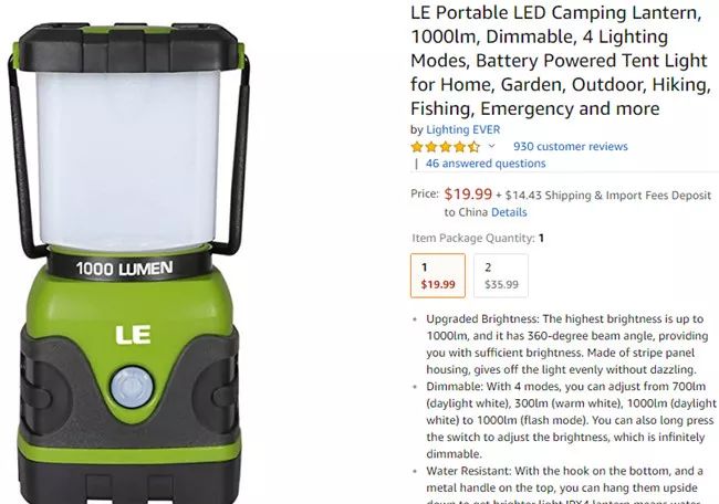 这款产品有四种不同照明模式可供选择(包括日光、暖光和闪光),由3节D型电池供电,且防水的功能使得它适合用于户外活动。产品顶部有一个金属手柄,其360度的光照角度还可以为使用者照亮四周环境。