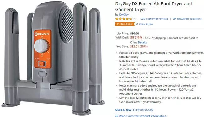 这款产品可用于烘干4只靴子、手套或任何能放置于烘干管上的衣服。它的温度可以达到105华氏度,具有帮助去除异味、减少衣服上的细菌或霉菌的功能。每款产品配有两个可拆卸的延长管,这样使用者就可以烘干高达16英寸的靴子。值得注意的是,其旋转鼓风机的音量可以说是声若蚊蝇。