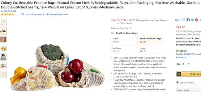 这款产品采用了可生物降解的天然棉网布,可用于机洗,耐用的双针缝合接缝允许其装入较重的物品。每个袋子上都有一个标签,上面标注着皮重。每款产品为9件装,包括3个大号、3个中号以及三个小号袋子。