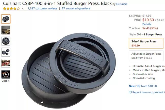 这款产品适合用于压制汉堡包和馅饼,可容纳3/4磅重,且带有不粘锅涂层。此外,它还可以放入洗碗机清洗。