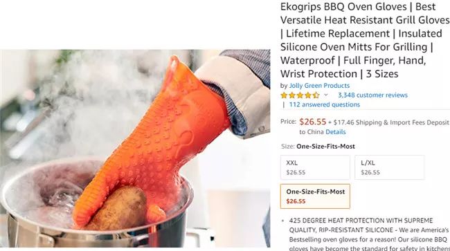 这款产品可承受温度高达425华氏度的物品,使用者可以直接在烤架上翻转食物,或者防止自己受到高温的伤害。戴上它不会限制手指的灵活使用,而且它的防滑设计可以防止使用者手里的东西不慎掉落。