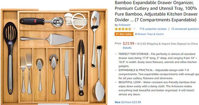 该产品采用环保的竹子制作而成,具有防水作用。它的宽度可以从14英寸扩大到18.9英寸,为使用者的厨房用具提供了大量的存储空间(有7到9个收纳格子)