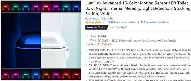 这款产品有16种不同的灯光颜色可供选择,使用者可以将其设置为灯光轮换模式,或者简单地选择自己最喜欢的颜色。该产品还有一个内置的动作和光照感应器,当使用者不在房间内或光线足够亮的时候,它就不会打开。此外,它可以灵活弯曲,因此几乎能够适用于任何尺寸的马桶。