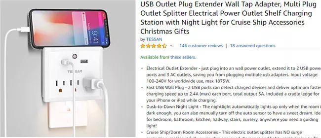 该产品为使用者提供了三个插座和两个USB端口。它还有一个内置的夜灯,在房间足够暗的时候会自动打开。由于没有浪涌保护装置,它也适用于游轮使用。